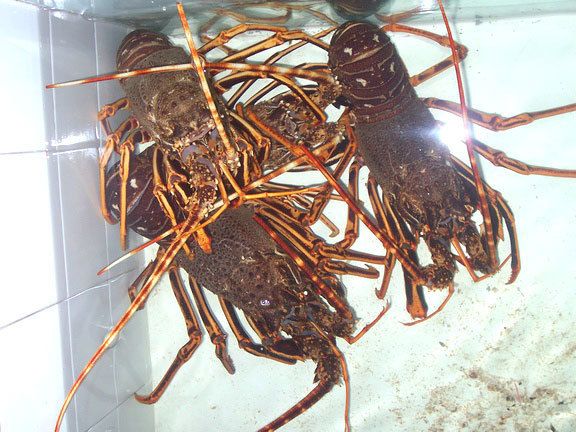 La langosta es otra de las estrellas de los mariscos, siendo su carne de las más apreciadas. La langosta (Palinurus elephas) es un crustáceo decápodo invertebrado con cinco pares de patas y una cola en forma de abanico. Su duro caparazón espinado le sirve como defensa ante posibles depredadores que controla con el largo par de antenas que le salen de la cabeza. Tiene el cuerpo de colores pardos y violetas con manchas amarillas. Su hábitat son los fondos rocosos en profundidades entre 20 y 60 metros, descendiendo en impresionantes migraciones hasta profundidades mayores en invierno. Son peregrinaciones en fila, en las que la langosta que va detrás va protegiéndole el abdomen con las antenas a la que la precede. Estas antenas le sirven de radar además de instrumento de defensa.
